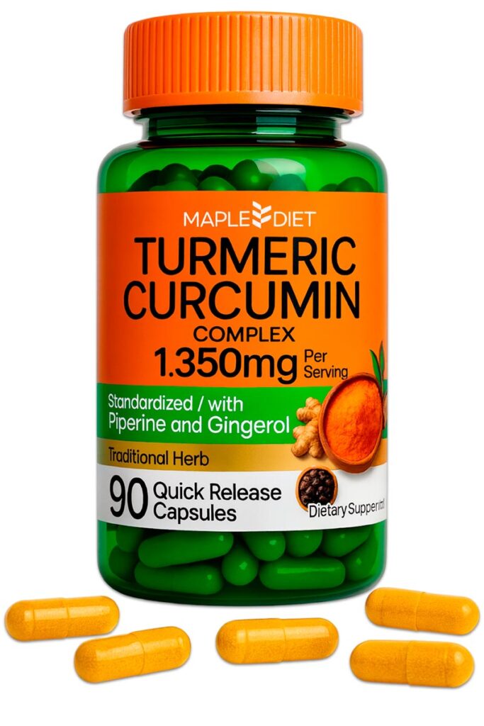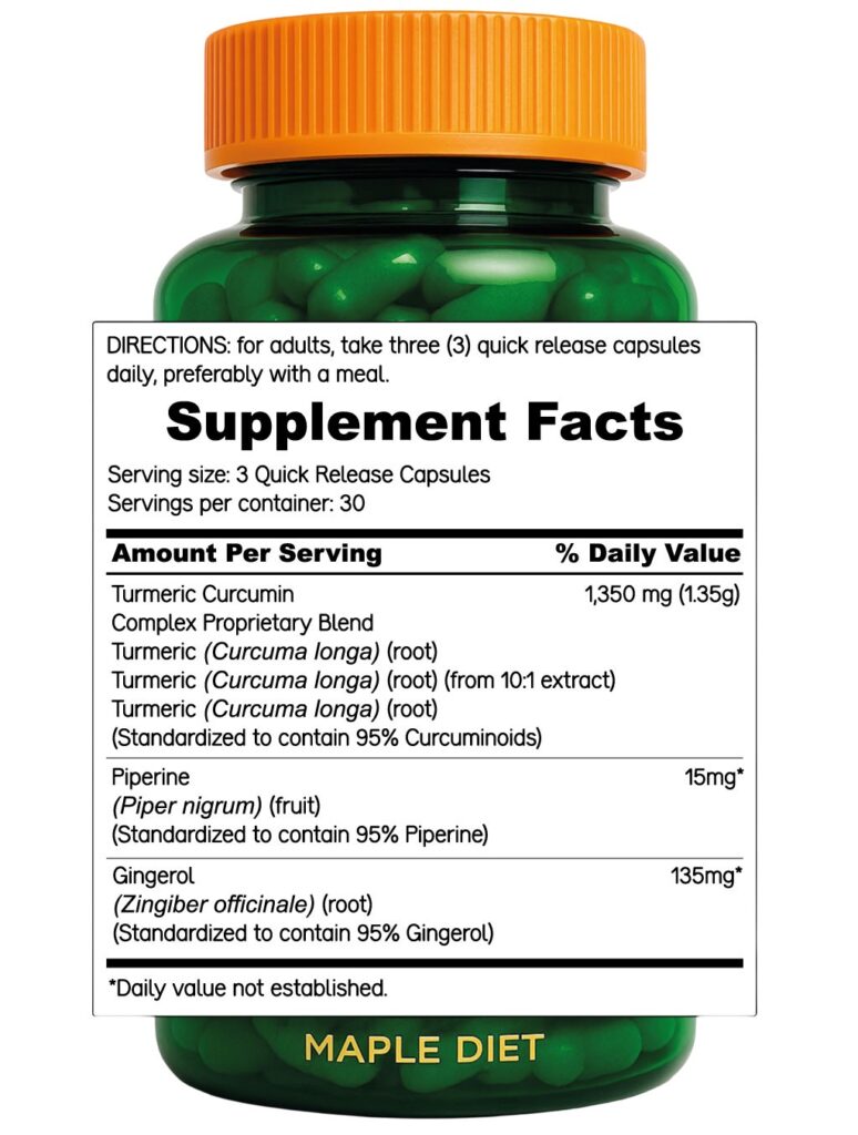 Suplemento alimenticio premium elaborado con cúrcuma (1.350 mg), jengibre (135 mg) y pimienta negra (15 mg) por servicio de 3 cápsulas. Ideal para apoyo articular, digestión saludable y mejor absorción de nutrientes.